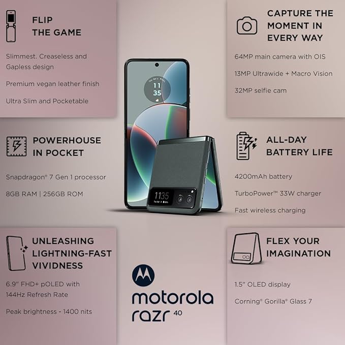 The Motorola razr 40 comes with 6.9-inch P-OLED display with 144Hz refresh rate and Qualcomm Snapdragon 7 Gen 1 processor. Specs also include 4200mAh battery with 30W charging speed and Dual camera setup on the back.